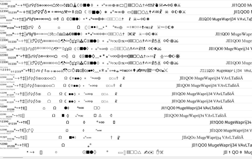 Nachträglich wurden auch nochmal Code2000, FreeSerif und Segoe UI Symbol als Vergleich dazugenommen. Siehe weitere Grafik. Stünde eine Entscheidung für ein größeres Projekt an, gäbe es keinen optimalen Font.